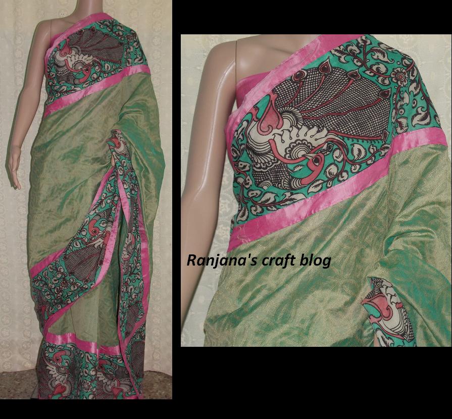 I never get contended with collecting and designing with traditional paintings of India. Kalmakari is one such art. I have kalmkari patches, kalamkari borders, kalamkari duppata, kalamkari saree , kalamkari hand block printed clothes etc. Still whenever I see clothes with kalamkari art, I end up buying that. :-). I have designed 3-4 sarees using kalamkari patches. First one was with Paisley designs , and recently designed some sarees with Kalamkari border for my customers.